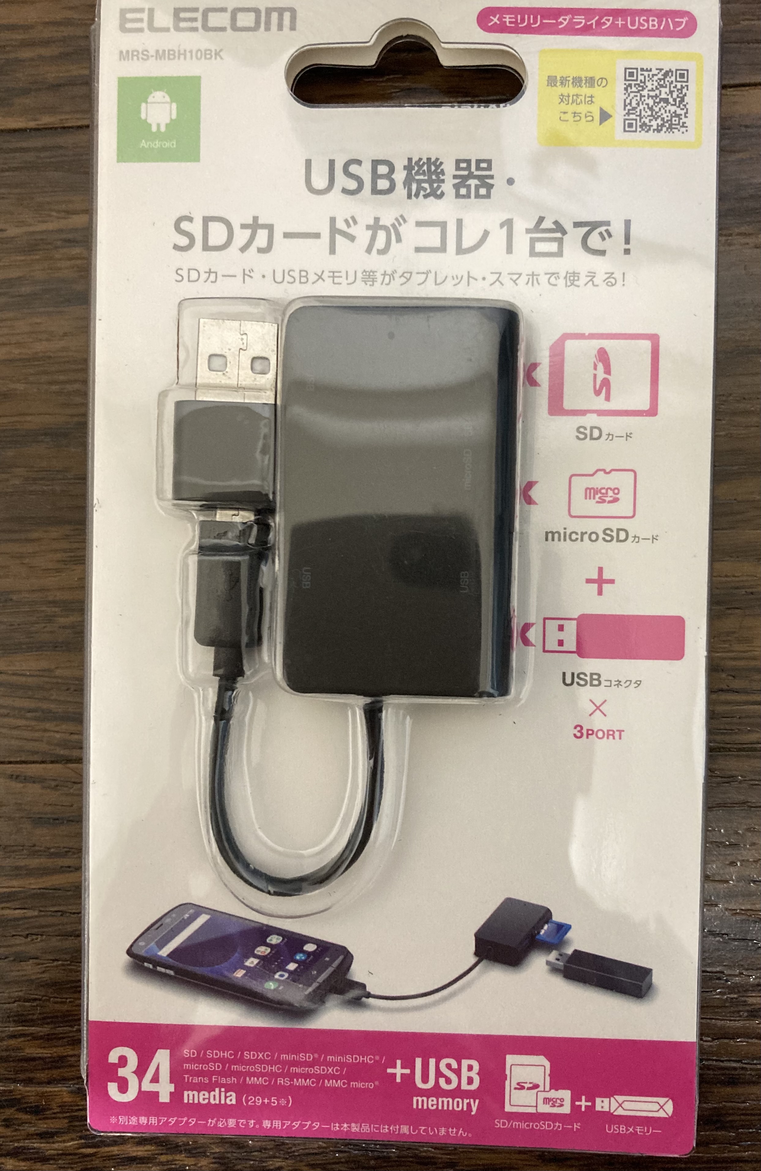 続いてこちらのコネクター。SDカードやUSBメモリをさせるハブで1080円と安かったので買いましたが、よく見ると対応しているのはUSB Type-Aとmicro USB Type-Bでした。microUSBはアンドロイド端末用ですが形状が似ていますね。こちらに関しては返品はせず、microUSB Type-BとUSB Type-Cをつなげるハブを買って対応することにしました。既に商品は到着しています。
